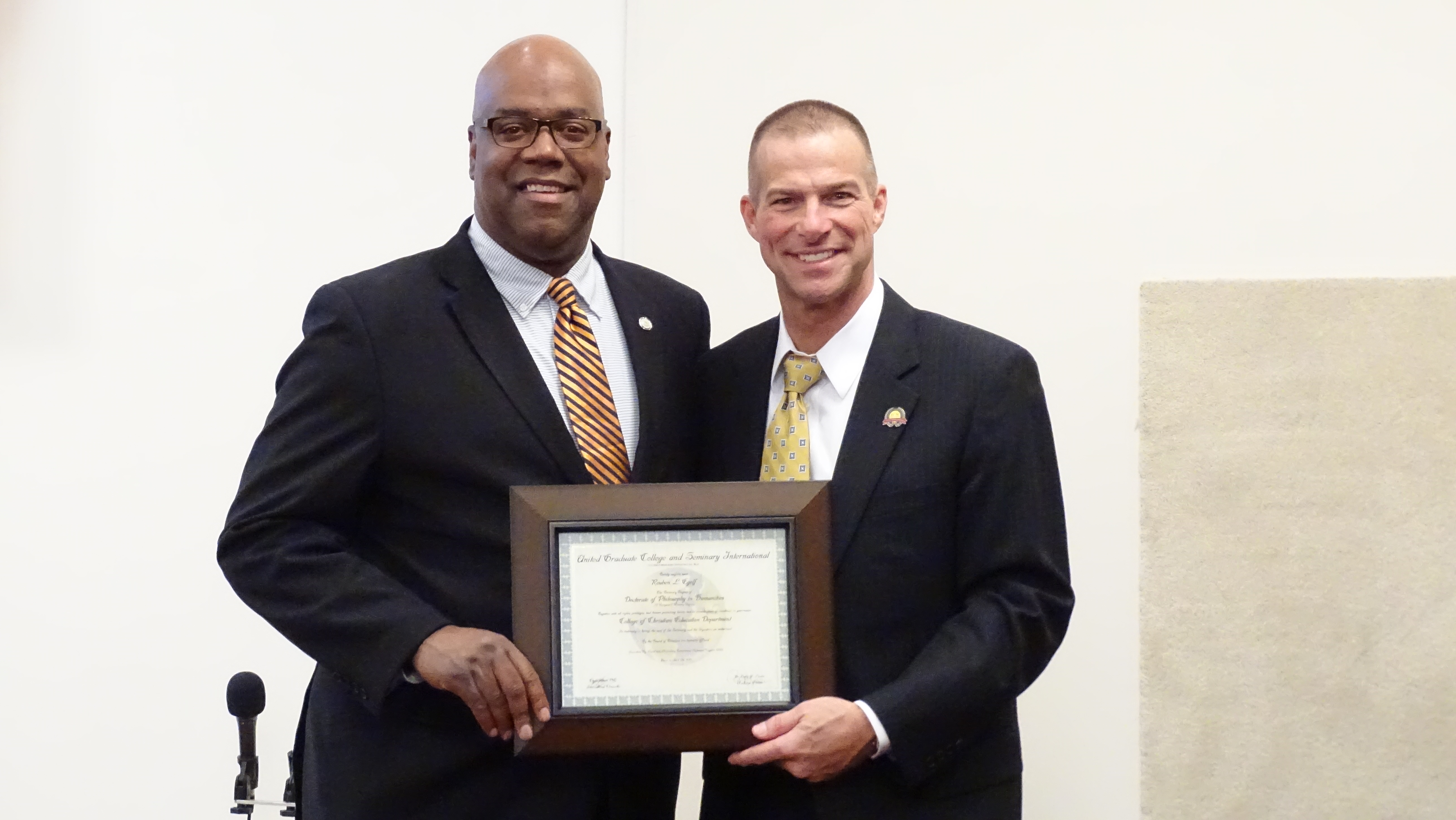 On Wednesday March 18th Reuben Egolf (pictured here) received a Doctorate of Philosophies in Humanities from the Chief Chancellor Dr. Clyde Rivers of the United Graduate College and Seminary International. The alumni consists of several presidents (former and current), first ladies, and distinguished leaders around the world.