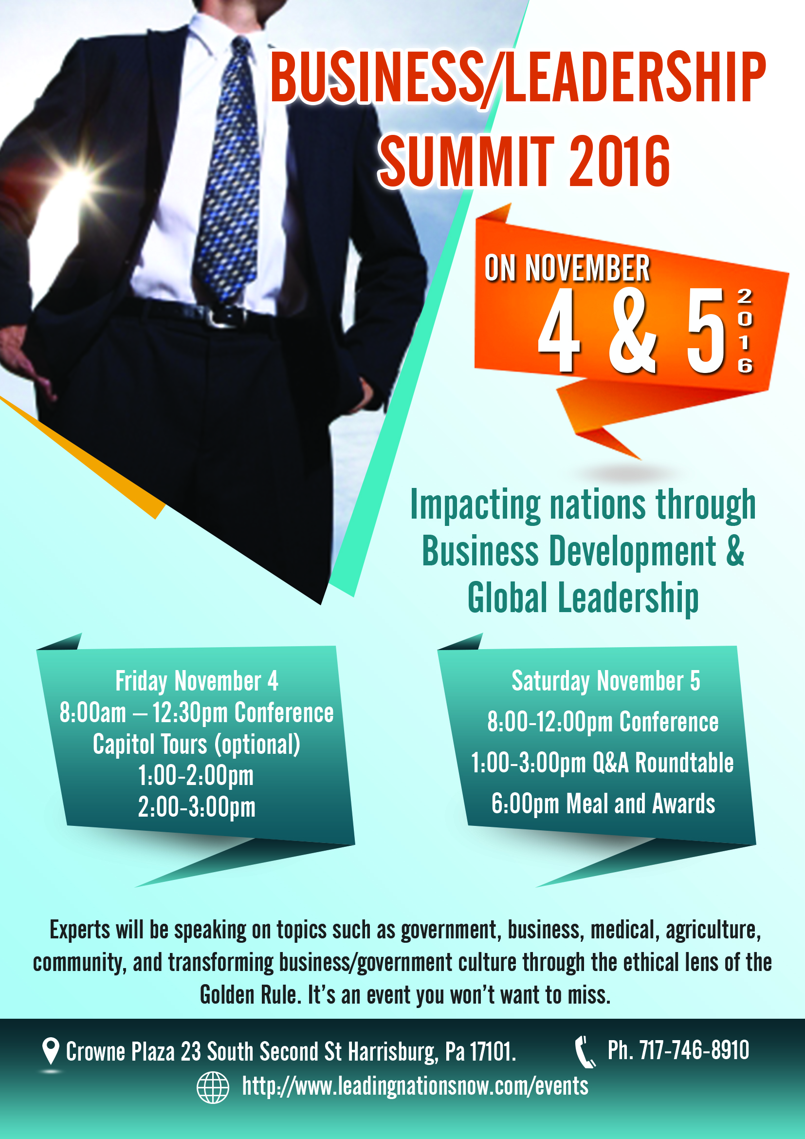 The upcoming Business/Leadership Summit 2016 being held in Harrisburg, Pa on Nov. 4-5 at the Crowne Plaza is listed under event tab. All registration including motel link and airport information is listed.